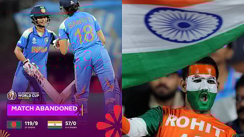 ബംഗ്ലാദേശ് ഉയര്ത്തി 120 റണ്സ് വിജയലക്ഷ്യം പിന്തുടര്ന്ന ഇന്ത്യ 8.4 ഓവറില് വിക്കറ്റ് നഷ്ടപ്പെടാത 57 റണ്സ് എന്ന നിലയില് എത്തിയപ്പോഴായിരുന്നു മഴയെത്തിയത്. തുടര്ന്ന് മത്സരം ഉപേക്ഷിക്കേണ്ടി വന്നു. സ്മൃതി മന്ദാന (34), അമന്ജോത് കൗര് (15) എന്ന നിലയിലായിരുന്നു ഇന്ത്യയുടെ സ്കോര്.