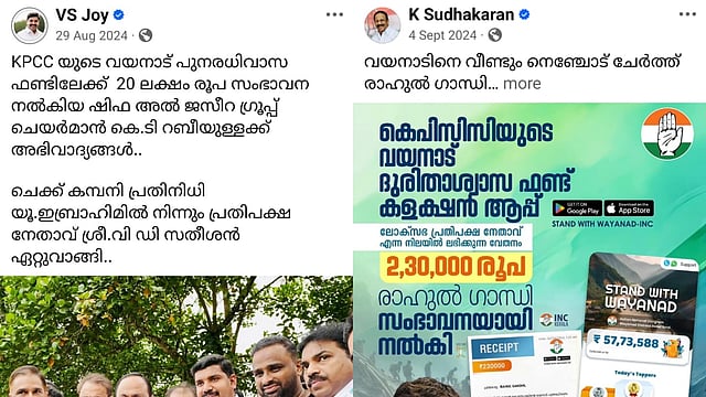 കോഴിക്കോട്: കെപിസിസി പുറത്തുവിട്ട വയനാട് പുനരധിവാസ ഫണ്ടുമായി ബന്ധപ്പെട്ട കണക്കുകളിൽ പൊരുത്തക്കേട്. 2024 സെപ്തംബർ നാല് വരെ ലഭിച്ചത് 57.73 ലക്ഷം രൂപയെന്ന മുൻ അധ്യക്ഷൻ കെ. സുധാകരന്റെ ഫേസ്ബുക്ക് കുറിപ്പിൽ പറയുന്നു. രാഹുൽ ഗാന്ധി 2.30 ലക്ഷം രൂപ നൽകിയതിന്റെ കണക്കിനൊപ്പമാണ് വിശദാംശം പങ്കുവെച്ചിരിക്കുന്നത്. ഇതിന് ശേഷം 34.5 ലക്ഷം കിട്ടിയതിന്റെ വിവരങ്ങൾ വി.എസ്. ജോയിയുടെ ഫെയ്സ്ബുക്ക് പേജിലുണ്ട്. യൂത്ത് കോൺഗ്രസും കോൺഗ്രസ് അനുകൂല സംഘടനകളും മൂന്നേകാൽ കോടിയോളം രൂപ നൽകിയതിന്റെ കണക്കുകളും പുറത്ത്.