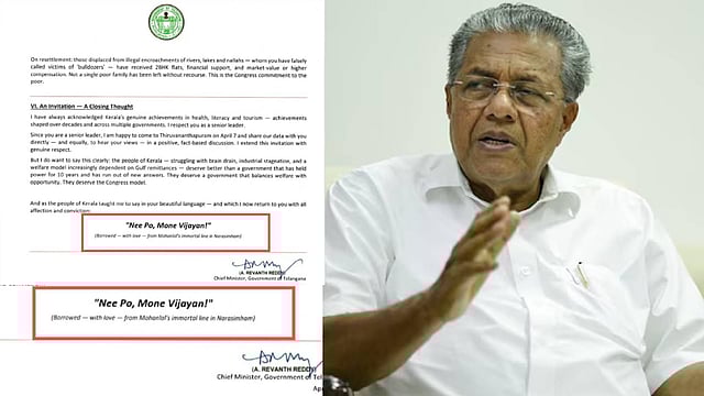 തിരുവനന്തപുരം: "ഡാഷ് മോനെ രേവന്താ, മറുപടി വരുന്നുണ്ടെന്ന" മുഖ്യമന്ത്രി പിണറായി വിജയന്റെ അതിരുവിട്ട പരാമർശത്തിലേക്ക് നയിച്ചത് രേവന്ത് റെഡ്ഡി ഫേസ്ബുക്കിൽ പിണറായി വിജയന് എഴുതിയ കത്തെന്ന് റിപ്പോർട്ട്. കത്തിൻ്റെ അവസാനവും "നീ പോ മോനെ വിജയാ" എന്ന് എഴുതിയിരുന്നു. ഒരു മുഖ്യമന്ത്രി മറ്റൊരു മുഖ്യമന്ത്രിക്ക് അയക്കുന്ന കത്തുകളിൽ പൊതുവിൽ ഉണ്ടാകാറില്ലാത്ത ഈ പരാമർശമാണ് പിണറായി വിജയനെ ചൊടുപ്പിച്ചതെന്നാണ് സൂചന.