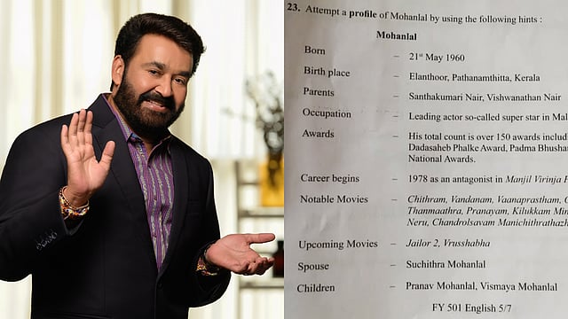 കൊച്ചി: പ്രായഭേദമന്യേ മലയാളികളുടെ ഇഷ്ടതാരമാണ് മോഹൻലാൽ. നടനെ ഒന്ന് കാണാനും സംസാരിക്കാനും കൊതിക്കാത്ത മലയാളികളുണ്ടാകാറില്ല. കഴിഞ്ഞ ദിവസം, ഹയർ സെക്കൻഡറി മോഡൽ പരീക്ഷ എഴുതാൻ ഇരുന്ന വിദ്യാർഥികൾ ചോദ്യപേപ്പറിലെ മോഹൻലാലിനെ കണ്ട് അതിശയിച്ചുപോയി. ഇംഗ്ലീഷ് പരീക്ഷയിലെ ഒരു ചോദ്യം നടന്റെ ജീവിതരേഖ തയാറാക്കാനായിരുന്നു.