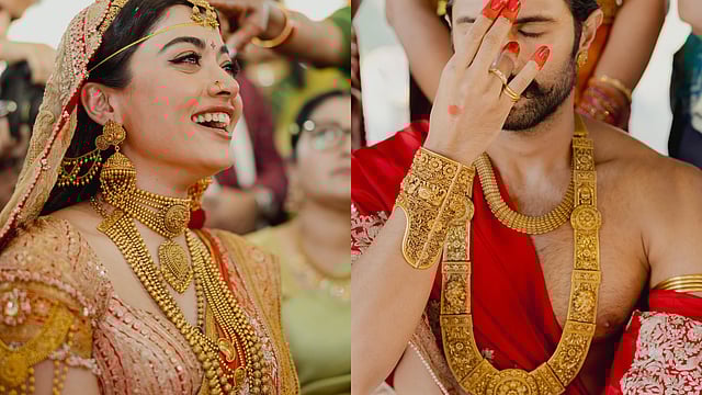 കൊച്ചി: ലോകം മിനിമൽ രീതിയിലുള്ള വിവാഹങ്ങളിലേക്ക് വഴിമാറുമ്പോൾ രശ്മിക മന്ദാനയുടേയും വിജയ് ദേവരകൊണ്ടയുടേയും കല്യാണത്തിന്റെ മുഖ്യ ആകർഷണം വരനും വധുവും ധരിച്ച കിലോ കണക്കിന് വരുന്ന സ്വർണാഭരണങ്ങളായിരുന്നു. രാജകീയ പ്രഭയിലാണ് താരങ്ങൾ വിവാഹ വേദിയിലേക്ക് എത്തിയത്.