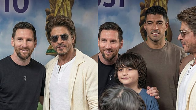 പിടിഐ എക്സിൽ പങ്കുവച്ച ഒരു വീഡിയോയിൽ ഷാരൂഖ് ഖാനും മകൻ അബ്രാം ഖാനും ലയണൽ മെസിയെ വേദിയിൽ കണ്ടുമുട്ടുന്നത് കാണാം. കൂൾ ലുക്കിലാണ് ഷാരൂഖും മകനും മെസിയെ കാണാൻ എത്തിയത്.