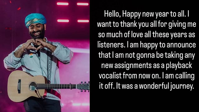 'എല്ലാവർക്കും പുതുവത്സരാശംസകൾ. ഇത്രയും വർഷങ്ങൾ എന്നെ സ്നേഹിച്ച എൻ്റെ ശ്രോതാക്കൾക്ക് നന്ദി. ഒരു പിന്നണി ഗായകനെന്ന നിലയിൽ ഞാൻ പുതിയ പാട്ടുകൾ ഒന്നും ഇനി പാടുന്നില്ല. ഞാൻ പിന്മാറുകയാണ്. ഇതൊരു മനോഹരമായ യാത്രയായിരുന്നു'എന്നാണ് അരിജിത് സിംഗ് ഇൻസ്റ്റഗ്രാമിൽ കുറിച്ചത്.