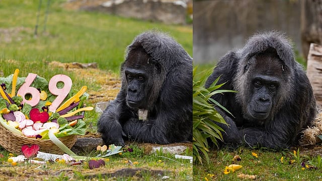 ജർമനി ബെർലിനിലെ മൃഗശാലയിൽ ജീവനക്കാർക്കും സന്ദർശകർക്കുമൊപ്പം 69ാം ജന്മദിനം ആഘോഷിച്ച് ഫാറ്റൂ എന്ന ഗൊറില്ല. ആറ് പതിറ്റാണ്ട് പിന്നിട്ട് എഴുപതുകളിലേക്ക് കടക്കുന്നതോടെ ലോകത്തിലെ തന്നെ ഏറ്റവും പ്രായമുള്ള ഗൊറില്ല എന്ന റെക്കോർഡും ഈ ഗൊറില്ല മുത്തശ്ശി സ്വന്തമാക്കി. കാലം വരച്ച ചുളിവുകളും വെള്ളിനക്ഷത്രം പോലെ തിളങ്ങുന്ന മുടികളുമായി 69 വർഷം ജീവിച്ച ഫാറ്റൂ ചരിത്രത്തിന്റെ ഭാഗമായിരിക്കുകയാണ്. വാർധക്യത്തിലേക്ക് കടന്നതോടെ അല്പം പിടിവാശികൾ ഒക്കെയുണ്ടെങ്കിലും തന്നെ കാണാനെത്തിയവർക്ക് മുന്നിലെത്താൻ അവൾ മടികാണിക്കാറില്ല.