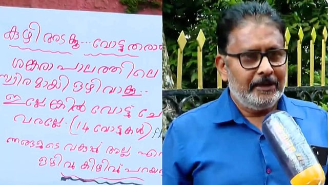 സ്ഥാനാർഥികൾക്കും പാർട്ടികൾക്കും മുന്നറിയിപ്പുമായി വീടിനു മുൻവശം പോസ്റ്റർ പതിച്ചിരിക്കുകയാണ് എറണാകുളം കാലടി പഞ്ചായത്തിലെ ജയന്തൻ നമ്പൂതിരി. ഗതാഗത തടസ്സത്തിന് പരിഹാരം കണ്ടില്ലെങ്കിൽ വോട്ട് ചോദിക്കേണ്ടെന്നാണ് ജയന്തൻ നമ്പൂതിരിയുടെ മുന്നറിയിപ്പ്. കാലടി ടൗണിൽ പെരുമ്പാവൂരിനെ ബന്ധിപ്പിക്കുന്ന ശ്രീ ശങ്കരാ പാലത്തിലെ ശോചനീയാവസ്ഥയിൽ പ്രതിഷേധിച്ചാണ് വീടിനു മുൻവശം പോസ്റ്റർ പതിച്ചത്. കുഴികൾ അടച്ച് ഗതാഗതക്കുരുക്ക് പരിഹരിച്ചില്ലെങ്കിൽ കുടുംബത്തിലെ 14 വോട്ട് ഒരു മുന്നണിക്കും കിട്ടില്ലെന്ന് ജയന്തൻ നമ്പൂതിരി പറഞ്ഞു.