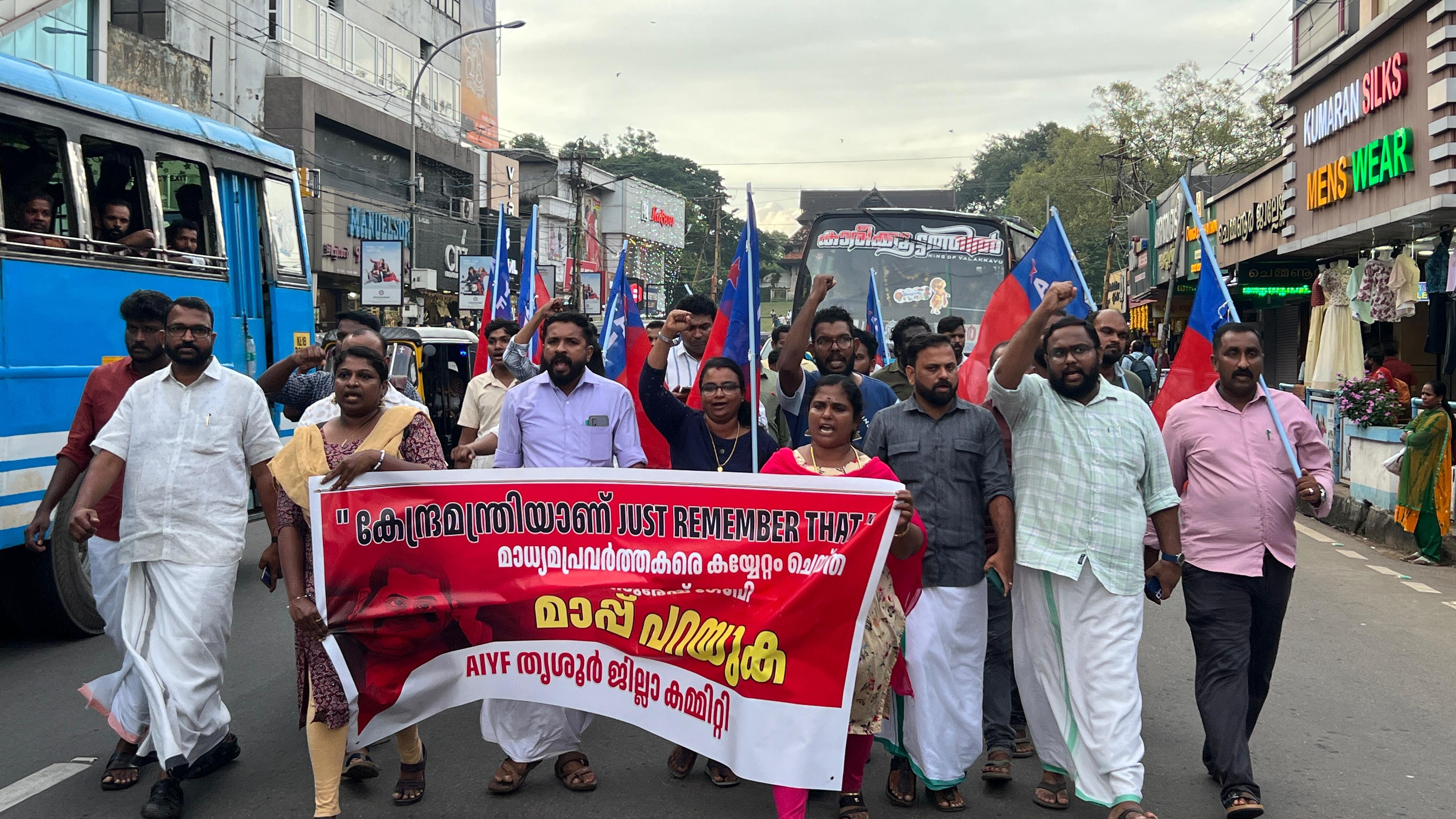 തൃശൂരിൽ മാധ്യമപ്രവർത്തകരുടെ ചോദ്യങ്ങൾക്കു മുന്നിൽ പ്രകോപിതനായി അവരെ കയ്യേറ്റം ചെയ്ത സുരേഷ് ഗോപിയുടെ നടപടി ഭരണ ഘടന ലംഘനമാണ്. വിമർശനങ്ങളോടുള്ള വിയോജിപ്പ് ജനാധിപത്യ സംവിധാനത്തിന് അപമാനമാണ്. സംഭവത്തിൽ സുരേഷ് ഗോപി മാധ്യമ പ്രവർത്തകരോടും പൊതു സമൂഹത്തോടും മാപ്പ് പറയണമെന്നും എഐവൈഎഫ് സംസ്ഥാന പ്രസിഡന്റ് എൻ അരുണും സെക്രട്ടറി ടി ടി ജിസ്മോനും പ്രസ്താവനയിലൂടെ ആവശ്യപ്പെട്ടു.