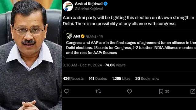 വരാനിരിക്കുന്ന ഡൽഹി നിയമസഭാ തെരഞ്ഞെടുപ്പിൽ ആം ആദ്മി പാർട്ടി സ്വതന്ത്രമായി മത്സരിക്കുമെന്നും, കോൺഗ്രസുമായി സഖ്യത്തിനില്ലെന്നും വ്യക്തമാക്കി ആം ആദ്മി പാര്ട്ടി നേതാവും ഡല്ഹി മുന് മുഖ്യമന്ത്രിയുമായ അരവിന്ദ് കെജ്രിവാൾ. എക്സ് പോസ്റ്റിലൂടെയാണ് കെജ്രിവാൾ നിലപാട് വ്യക്തമാക്കിയത്. “എഎപി ഈ തെരഞ്ഞെടുപ്പിനെ ഡൽഹിയിൽ സ്വന്തം ശക്തിയിൽ നേരിടും. കോൺഗ്രസുമായി ഒരു സഖ്യത്തിനും സാധ്യതയില്ല,” എന്നും അദ്ദേഹം എക്സിൽ കുറിച്ചു. സീറ്റ് വിഭജനം സംബന്ധിച്ച എഎൻഐ വാർത്ത നിഷേധിച്ചാണ് കെജ്രിവാളിന്റെ എക്സ് പോസ്റ്റ്.