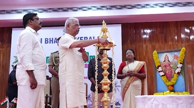തിരുവനന്തപുരം: രാജ്ഭവനിലെ പരിപാടിയിൽ വീണ്ടും കാവിക്കൊടിയേന്തിയ ഭാരതാംബ. കേരളപ്പിറവി ദിനാഘോഷത്തിൽ കാവി കൊടിയേന്തിയ ഭാരതാംബയുടെ ചിത്രം വച്ചു. രാജ്ഭവനിൽ സംഘടിപ്പിച്ച ദിനാഘോഷത്തിലാണ് വീണ്ടും കാവി കൊടിയേന്തിയ ഭാരതാംബ ചിത്രം ഉൾപ്പെടുത്തിയത്. മുഖ്യമന്ത്രി പങ്കെടുത്ത പരിപാടിയിലും ശ്യാമ പ്രസാദ് മുഖർജി ദിനാചരണത്തിലും ചിത്രം ഒഴിവാക്കിയിരുന്നു.