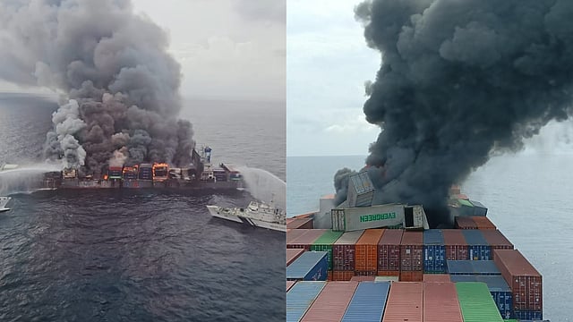 തീപിടിച്ച വാൻ ഹായ് 503 കപ്പൽ Source: x/ Indian Coast Guard