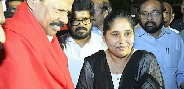കണ്ണൂർ: സിപിഐഎം സംസ്ഥാന സെക്രട്ടറി എം.വി. ഗോവിന്ദൻ നയിക്കുന്ന വടക്കൻ മേഖല വികസന മുന്നേറ്റ ജാഥയിൽ പങ്കെടുത്ത് രക്തസാക്ഷി സി.വി. ധനരാജിൻ്റെ ഭാര്യ സജിനിയും. പയ്യന്നൂരിലെ പരിപാടിയിൽ എം.വി. ഗോവിന്ദനെ ചുവന്ന ഷാൾ അണിയിച്ച് സ്വീകരിച്ചത് സജിനിയാണ്. ധനരാജ് രക്തസാക്ഷി ഫണ്ട് തിരിമറിയുമായി ബന്ധപ്പെട്ട വിവാദങ്ങൾക്കിടെയാണ് എം.വി. ഗോവിന്ദന് ധനരാജിന്റെ ഭാര്യ സജിനി ഷാൾ അണിയിച്ചത്. രക്തസാക്ഷി ഫണ്ട് തിരിമറിയുമായി ബന്ധപ്പെട്ട് ആരോപണവിധേയനായ ടി.ഐ. മധുസൂദനൻ എംഎൽഎയും ചടങ്ങിൽ പങ്കെടുത്തു.