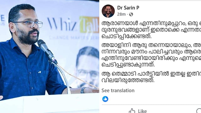 'ആ തെമ്മാടി പാര്ട്ടിയില് ഇതല്ല, ഇതിനുമപ്പുറം നടക്കുമെന്നാണ് കേരള സമൂഹം വിലയിരുത്തേണ്ടത്' എന്നാണ് സരിന്റെ പ്രതികരണം. അയാള് ആരായാലും ഒത്താശ ചെയ്തവരും കൂട്ടു നിന്നവും മൗനം പാലിച്ചവരും ആരൊക്കെയാണെന്നും എന്തിനുവേണ്ടിയായിരിക്കും എന്നുമൊക്കെ ആലോചിക്കുമ്പോഴാണ് കൂടുതല് ചെടിപ്പുണ്ടാകുന്നതെന്നും ഫേസ്ബുക്ക് പോസ്റ്റില് പറയുന്നു.