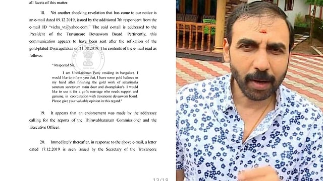 "ശബരിമല ശ്രീകോവിലിന്റെ പ്രധാന വാതിലിന്റെയും ദ്വാരപാലകരുടെയും സ്വർണപ്പണി പൂർത്തിയാക്കിയ ശേഷം എന്റെ കൈയിൽ കുറച്ച് സ്വർണം ബാക്കിയുണ്ടെന്ന് നിങ്ങളെ അറിയിക്കാൻ ഞാൻ ആഗ്രഹിക്കുന്നു. തിരുവിതാംകൂർ ദേവസ്വം ബോർഡുമായി ചേർന്ന് സഹായം ആവശ്യമുള്ള ഒരു പെൺകുട്ടിയുടെ വിവാഹത്തിന് ഇത് ഉപയോഗിക്കാൻ ഞാൻ ആഗ്രഹിക്കുന്നു. ഇക്കാര്യത്തിൽ നിങ്ങളുടെ വിലയേറിയ അഭിപ്രായം ദയവായി അറിയിക്കുക," എന്നാണ് മെയിലിൽ ഉണ്ണിക്കൃഷ്ണൻ പോറ്റി പറയുന്നത്. ഇതിന്റെ അടിസ്ഥാനത്തിൽ, അധിക സ്വർണം എന്തുചെയ്യാൻ കഴിയുമെന്നതിനെക്കുറിച്ച് വ്യക്തത വരുത്തണമെന്ന് ദേവസ്വം സെക്രട്ടറി 2019 ഡിസംബർ 17ന് ആവശ്യപ്പെട്ടിരുന്നു.