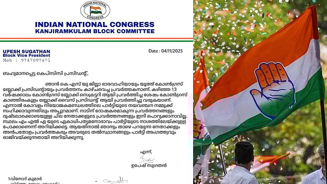 കാഞ്ഞിരംകുളം ബ്ലോക്ക് വൈസ് പ്രസിഡൻ്റ് ഉപേഷ് സുഗതനാണ് കെപിസിസി പ്രസിഡൻ്റ് സണ്ണി ജോസഫിന് കത്ത് കൈമാറിയത്. കോവളം നിയോജകമണ്ഡലത്തിലെ പാർട്ടിയുടെ നയവഞ്ചന സഹിക്കാവുന്നതിലും അപ്പുറമാണെന്ന് രാജികത്തിൽ പറയുന്നു.