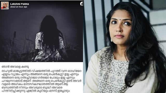 "ഞാൻ അവളെ കണ്ടു, രാഹുൽ മാങ്കൂട്ടത്തിൽ വിഷയത്തിൽ പുറത്ത് വന്ന ഓഡിയോ എല്ലാം വ്യാജം എന്നും അങ്ങനെ ഒരു പെൺകുട്ടി ഇല്ല എന്നും അങ്ങനെ ഒരു ഗർഭച്ഛിദ്രമോ ഗർഭമോ പോലും ഇല്ല എന്നും പറയുന്നവരോട് ആണ്. അങ്ങനെ ഒരു പെൺകുട്ടി ഉണ്ട്", ന്യൂസ് മലയാളം അസോസിയേറ്റ് എഡിറ്റർ ലക്ഷ്മി പദ്മ സോഷ്യൽ മീഡിയയിൽ പങ്കുവച്ചു.