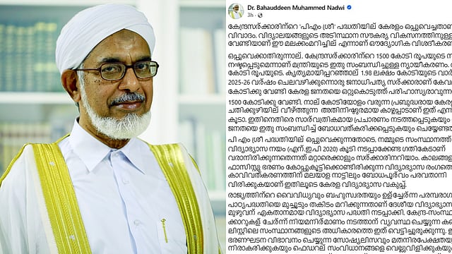 പിഎം ശ്രീ പദ്ധതിയിൽ ഒപ്പിട്ട സംസ്ഥാന സർക്കാരിനെതിരെ സമസ്ത. 1500 കോടി രൂപയ്ക്ക് വേണ്ടി കേരള ജനതയെ ഒറ്റുകൊടുത്തുവെന്ന് സമസ്ത മുശാവറാ അംഗം ഡോ. ബഹാവുദ്ദീൻ മുഹമ്മദ് നദ്വി. കാവിവൽക്കരണത്തിന് ബോധപൂർവ്വം വിദ്യാഭ്യാസ വകുപ്പ് പരവതാനി വിരിക്കുന്നു എന്നും വിമർശനം. ഫേസ്ബുക്ക് പോസ്റ്റിലാണ് നദ്വിയുടെ വിമർശനം.