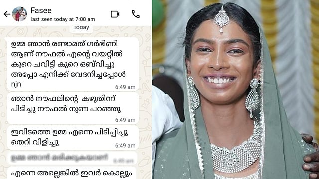 മരിക്കുന്നതിന് മുമ്പ് ഫസീല ഉമ്മയ്ക്ക് അയച്ച വാട്സാപ്പ് സന്ദേശത്തിൽ ജീവനൊടുക്കാനുള്ള കാരണം വ്യക്തമാക്കിയിട്ടുണ്ട്. താൻ രണ്ടാമതും ഗർഭിണിയാണെന്നും ഭർത്താവ് നൗഫൽ വയറ്റിൽ ചവിട്ടിയെന്നും കയ്യൊടിച്ചുവെന്നും വ്യക്തമാക്കുന്നുണ്ട്.