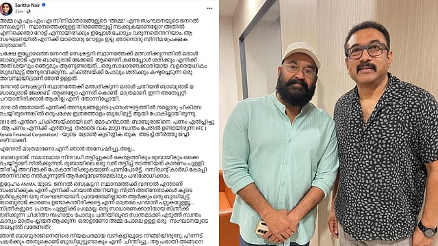 2018 ൽ അതായത് എനിക്ക് അസുഖങ്ങളുടെ പ്രാരംഭഘട്ടത്തിൽ നല്ലൊരു ചികിത്സ ചെയ്തിരുന്നെങ്കിൽ ഒരുപക്ഷേ ഇത്രത്തോളം ബുദ്ധിമുട്ട് ആയി പോകില്ലായിരുന്നു. 2018 ൽ എൻറെ ചികിത്സയ്ക്കായി ശ്രീ .മോഹൻലാൽ ബാബുരാജിനെ പണം ഏൽപ്പിച്ചു . ആ പണം എനിക്ക് എത്തിച്ചു തരാതെ വക മാറ്റി സ്വന്തം പേരിൽ ഉണ്ടായിരുന്ന KFC ( Kerala Financial Corporation) - യുടെ ലോൺ കുടിശ്ശിക തുക അടച്ച് തീർത്തൂ ജപ്തി ഒഴിവാക്കി.