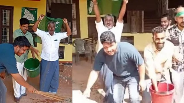 തളിച്ചത് പച്ച വെള്ളം എന്നാണ് യുഡിഎഫ് പഞ്ചായത്ത് കമ്മിറ്റി ചെയര്മാന് മൂസ കോത്തബ്രയുടെ വിശദീകരണം. പാര്ട്ടിയുടെയോ യുഡിഎഫ് നേതൃത്വത്തിന്റെയോ അറിവൊടെയല്ല ലീഗ് പ്രവര്ത്തകര് പച്ച വെള്ളം തളിച്ചത്, വലിയ വിജയം നേടിയപ്പോള് പ്രവര്ത്തകര് ആവേശത്തില് ചെയ്തതെന്നും മൂസ കോത്തബ്ര വിശദീകരിക്കുന്നു.