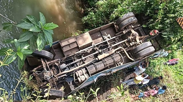 കൈവരികളോ സുരക്ഷാ ബാരിക്കേഡുകളോ ഇല്ലാത്ത പാലത്തില് നിന്നാണ് ബസ് പുഴയിലേക്ക് മറിഞ്ഞത്. പാലത്തിനോട് ചേര്ന്നുള്ള കലുങ്കില് ഇടിച്ച് ബസ് നിയന്ത്രണം വിട്ട് പുഴയിലേക്ക് മറിയുകയായിരുന്നുവെന്ന് ദൃക്സാക്ഷികള് പറയുന്നു.