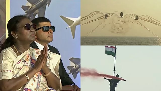 ശംഖുമുഖത്തേക്ക് ഒഴുകിയെത്തിയ ആയിരങ്ങളെ സാക്ഷിയാക്കി എംഎച്ച് 60 ആർ ഹെലികോപ്റ്ററുകൾ രാഷ്ട്രപതിക്ക് ആകാശത്ത് നിന്നും സല്യൂട്ട് നൽകി. പിന്നാലെ പോർമുഖത്തെ നാവിക സേനയുടെ പ്രവർത്തനങ്ങൾ പുനരാവിഷ്കരിച്ചു അഭ്യാസപ്രകടനങ്ങൾ നടത്തി. നടുക്കടലിൽ നിന്നും മിഗ് 29 യുദ്ധവിമാനമുയർത്തി ഇന്ത്യയുടെ അഭിമാനമായ ഐഎൻഎസ് വിക്രാന്ത്. സീ ക്കിങ്, സീ ഹോക്, കമാവോ, പി. 8 ഐ എയർക്രാഫ്റ്റുകളും കാണികളെ മുൾമുനയിൽ നിർത്തിയ അഭ്യാസപ്രകടനങ്ങളുമായി ചടങ്ങിന്റെ ഭാഗമായി.