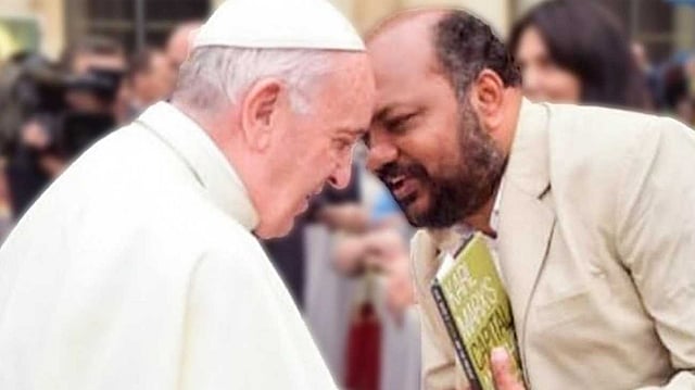 'ഞാനൊരു കമ്യൂണിസ്റ്റാണ്. കേരളത്തില്നിന്നും വരുന്നു' എന്ന് പറഞ്ഞുകൊണ്ട് ഞാന് സംഭാഷണം ആരംഭിച്ചപ്പോള് ദൈവം നിങ്ങള്ക്കൊപ്പമുണ്ടാകട്ടെ, ദൈവം നിങ്ങളെ അനുഗ്രഹിക്കട്ടെ എന്നു പറഞ്ഞ് അദ്ദേഹം ഒരു ജപമാല എനിക്ക് സമ്മാനിച്ചു. എന്റെ കയ്യിലുണ്ടായിരുന്ന 'karl Marx's capital and Present' എന്ന പുസ്തകമായിരുന്നു തിരികെ ഞാന് അദ്ദേഹത്തിന് നല്കിയത്.