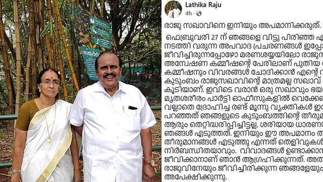 മുൻ എംഎല്എയും സിപിഐ നേതാവുമായ പി. രാജുവിൻ്റെ മൃതദേഹം പാർട്ടി ഓഫീസിൽ വയ്ക്കേണ്ട എന്നത് കുടുംബത്തിൻറെ തീരുമാനമെന്ന് ഭാര്യ ലതികാ രാജു. അപമാനിക്കാൻ ശ്രമിച്ചാൽ തെളിവുകൾ നിരത്തുമെന്നും ലതികാ രാജു ഫേസ്ബുക്കിൽ കുറിച്ചു. ഒരു അന്വേഷണ കമ്മീഷനും വിവരങ്ങൾ ചോദിക്കാൻ വീട്ടിൽ വന്നിട്ടില്ല. അപമാനം തുടർന്നാൽ തെളിവുകൾ നിരത്തിക്കൊണ്ട് എന്തുകൊണ്ട് ആ തീരുമാനം എടുത്തു എന്ന് പറയാൻ നിർബന്ധിതയാകും എന്നും ലതികാ രാജു ഫേസ്ബുക്കിൽ കുറിച്ചു.
