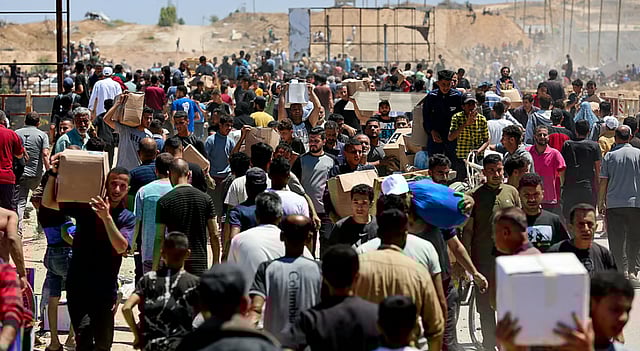 ഹ്യുമാനിറ്റേറിയൻ ഫൗണ്ടേഷനിൽ നിന്ന് ലഭിച്ച സഹായ സാമഗ്രികളുമായി പലസ്തീനികൾ Reuters