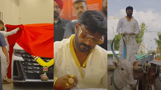ഓഫീസിന് പുറത്ത് സഞ്ജുവിന്റെ ആകർഷകമായ ആഡംബരവാഹനങ്ങൾ അണിനിരന്നു. അതിൽ പോർഷെ പനാമേര, ഫോർഡ് മസ്റ്റാങ്, മസെരാട്ടി ലെവാന്റെ, ടൊയോട്ട ഇന്നോവ ഹൈക്രോസ്, ടൊയോട്ട ഫോർച്യൂണർ എന്നിവ ഉൾപ്പെടുന്നു. പക്ഷെ ജീവനക്കാരും സെക്യൂരിറ്റി ടീമും വിവിധ കാറുകളിൽ കയറിയപ്പോൾ, സഞ്ജു നേരേ കാളവണ്ടിയിലേക്ക്.