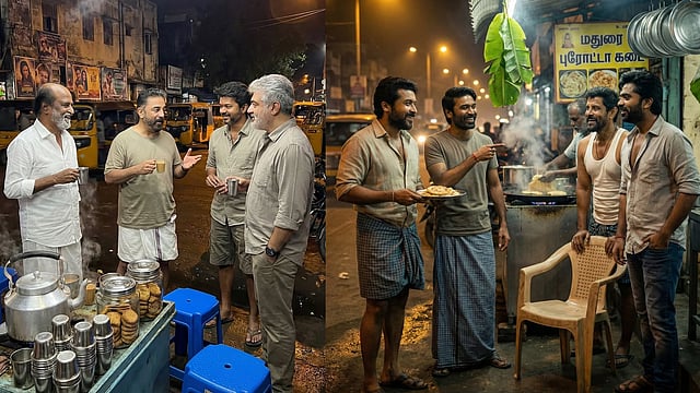 കള്ളിമുണ്ടും ഷർട്ടുമൊക്കെ ധരിച്ച് ചെന്നൈയിലെ തട്ടുകടയിൽ നിന്ന് ഭക്ഷണം കഴിക്കുന്ന തനി നാട്ടുമ്പുറത്തുകാരനായ സൂര്യയോട് കുശലം പറയുന്നവരെ കണ്ടോ... തമിഴകത്തിൻ്റെ സൂപ്പർ താരങ്ങളായ ചിയാൻ വിക്രമും ധനുഷും സിലമ്പരസനും ഒക്കെയാണ് കൂടെയുള്ളത്. സ്ട്രീറ്റ് ലൈറ്റുകൾക്ക് താഴെ അരണ്ട വെളിച്ചത്തിൽ നിൽക്കുന്ന താരങ്ങളുടെ ചിത്രങ്ങൾ കണ്ടാൽ പുതിയ സിനിമയുടെ ഷൂട്ടിങ്ങ് ലൊക്കേഷനിൽ നിന്നാണെന്ന് തോന്നിപ്പോകും... ഇനി അങ്ങനെ കരുതിയെങ്കിൽ നിങ്ങൾക്ക് തെറ്റി!