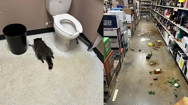 ശനിയാഴ്ച വിർജീനിയയിലെ ഒരു മദ്യശാലയിലെ ജീവനക്കാരാണ് രസകരമായി ഒരു മോഷണത്തിന് സാക്ഷ്യം വഹിച്ചത്. രാവിലെ ജോലിക്കെത്തിയ ജീവനക്കാർ കണ്ടത് നിലത്ത് ചിതറിക്കിടക്കുന്ന മദ്യക്കുപ്പികളും പരന്നൊഴുകിയ മദ്യവുമാണ്. മോഷണം നടന്നുവെന്നുറപ്പാക്കിയ ജീവനക്കാർ ബാത്റൂം തുറന്നതോടെയാണ് കള്ളൻ ബാത്റൂമിനകത്ത് അടിച്ചു പൂസായി കിടക്കുന്നത് കണ്ടത്. പക്ഷേ കള്ളൻ മനുഷ്യനായിരുന്നില്ല, ഒരു റാക്കൂൺ ആയിരുന്നുവെന്ന് മാത്രം.