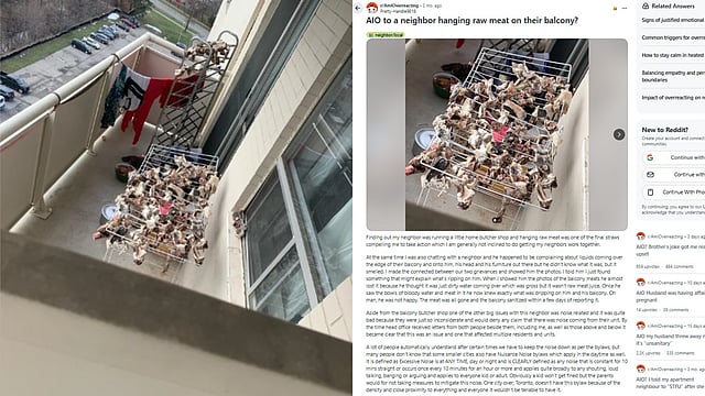 ബാൽക്കണിയിൽ തുണികൾ വിരിക്കുന്ന സ്റ്റാൻഡിൽ പച്ചമാംസം ഉണക്കാനിട്ടിരിക്കുന്ന ചിത്രം സഹിതമാണ് പോസ്റ്റ് റെഡിറ്റിൽ പങ്കുവച്ചത്. മാംസത്തിൽ ഈച്ചകൾ വന്നിരിക്കുന്നതും, രോഗങ്ങൾ ഉണ്ടാക്കുന്ന ബാക്ടീരിയകൾ വരുമെന്നുമുള്ള ആശങ്കകൾ, മാംസം ഉണക്കി സൂക്ഷിക്കുന്നതിന് അപ്പാർട്ട് മെന്റിലെ ബാൽക്കെണി തെരഞ്ഞെടുത്തത് മോശമായിപ്പോയെന്നും ഉൾപ്പെടെ പറഞ്ഞുകൊണ്ട് നിരവധിപ്പേരാണ് പോസ്റ്റിനോട് പ്രതികരിച്ചിരിക്കുന്നത്.