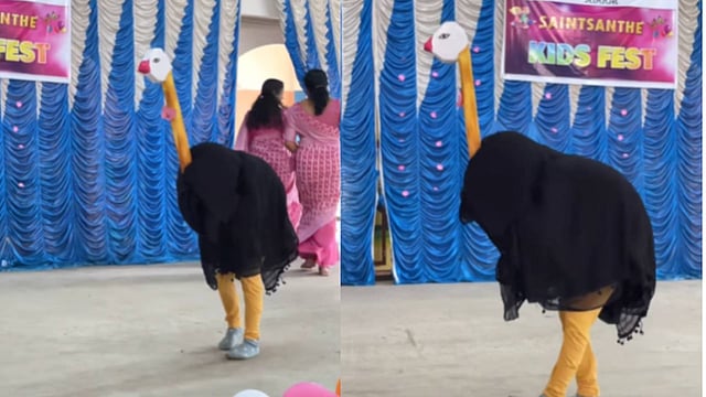 കുട്ടിയുടെ രസകരമായ ഒട്ടകപ്പക്ഷി വേഷം ഇൻ്റർനെറ്റ് ലോകത്തിന് നന്നായി ബോധിച്ചു. കൈലാഷ്. ആർ എന്ന വ്യക്തിയാണ് ഇൻസ്റ്റാഗ്രാമിൽ വീഡിയോ പങ്കുവെച്ചിരിക്കുന്നത്. വേഷത്തിൻ്റെ ബിടിഎസും കൈലാഷ് പങ്കുവെച്ചിട്ടുണ്ട്.