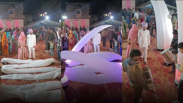 വിഷ്വൽ എഫക്റ്റിന് വേണ്ടി വിവാഹ പാര്ട്ടിയൊരുക്കിയ ഒരു എന്ട്രി അവിടെക്കൂടിയവരെ അമ്പരപ്പിച്ചു. ഒരു നിമിഷം വേദി മാറിയോ എന്ന ആശങ്ക വരെ ആളുകൾക്ക് തോന്നി. പൂക്കളും മറ്റും അലങ്കരിക്കുന്ന വേദിയിൽ മൃതദേഹങ്ങൾ നിരത്തിയ നിലയിലായിരുന്നു അലങ്കാരം. വെള്ളത്തുണികളിൽ പൊതിഞ്ഞ മൃതദേഹം പോലെ എന്തോ നിരത്തിക്കിടത്തിയ വേദിയിലേക്കാണ് വധുവരൻമാരെത്തിയത്.