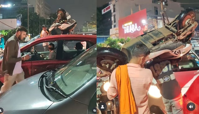 സംഭവം ഹരിയാനയിലെ ഗുഡ്ഗാവിലാണ്. ട്രാഫിക് ബ്ലോക്കില്പ്പെട്ടതോടെ യുവാക്കള് സ്കൂട്ടര് എടുത്തുകൊണ്ട് പോവുകയായിരുന്നു. ട്രാഫിക് ബ്ലോക്കില് നില്ക്കുകയായിരുന്നവരാണ് വീഡിയോ പകര്ത്തി സോഷ്യല് മീഡിയയില് പങ്കുവെച്ചത്.