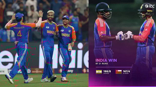 20 ഓവറില് എട്ട് വിക്കറ്റ് നഷ്ടത്തിലാണ് ഇന്ത്യ 189 റണ്സ് നേടിയത്. മറുപടി ബാറ്റിങ്ങിനിറങ്ങിയ ഒമാന് നാല് വിക്കറ്റ് നഷ്ടത്തില് നിശ്ചിത ഓവറില് 167 റണ്സ് നേടാനേ സാധിച്ചുള്ളൂ. ആമിര് കലീമും ഹമ്മദ് മിര്സയുമാണ് ഒമാന്റെ തകര്പ്പന് ബാറ്റര്മാര്.
