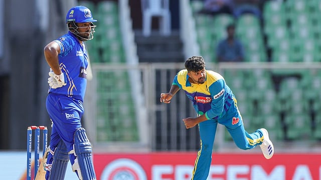 തിരുവനന്തപുരം: കേരള ക്രിക്കറ്റ് ലീഗിലെ ആവേശപ്പോരാട്ടത്തില് കൊച്ചി ബ്ലൂ ടൈഗേഴ്സിനെ വീഴ്ത്തി തൃശൂർ ടൈറ്റന്സ്. അഞ്ച് വിക്കറ്റിനാണ് ടൈറ്റന്സിന്റെ ജയം. ബ്ലൂ ടൈഗേഴ്സ് ഉയർത്തിയ 189 റണ്സ് വിജയലക്ഷ്യം അവസാനപന്തിലാണ് തൃശൂർ മറികടന്നത്. അർധ സെഞ്ച്വറിയുമായി കൊച്ചിക്കായി സഞ്ജു തിളങ്ങിയപ്പോള് സീസണിലെ ആദ്യ ഹാട്രിക്ക് ഉള്പ്പെടെ അഞ്ച് വിക്കറ്റ് വീഴ്ത്തി കെ. അജിനാസ് ബ്ലൂ ടൈഗേഴ്സിനെ വിറപ്പിച്ചു.