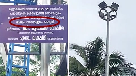 കഴിഞ്ഞദിവസം മണ്ണാർക്കാട് നഗരസഭാ ചെയർമാനാണ് ഹൈമാസ് ലൈറ്റിൻ്റെ ഉദ്ഘാടനം നിർവഹിച്ചത്. എന്നാൽ ഉദ്ഘാടന സമയത്ത് ആരും പേര് ശ്രദ്ധിച്ചില്ല. ബോർഡ് ഉടൻ മാറ്റണമെന്ന് സിപിഎം മണ്ണാർക്കാട് ലോക്കൽ സെക്രട്ടറി അജീഷ് കുമാർ ആവശ്യപ്പെട്ടു. എന്നാൽ ഇത്തരമൊരു വിഷയം ശ്രദ്ധയിൽപ്പെട്ടിട്ടില്ലെന്നാണ് കൗൺസിലറുടെ വാദം.